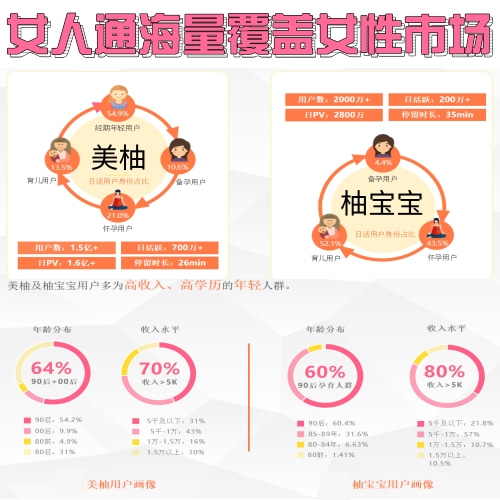美柚是国内较大的女性服务平台,美柚在育儿母婴和经期健康行业综合数据排名靠前,保持绝对优势。现如今,美柚拥有超1.5亿女性用户,占据了经期健康行业超过近80% 的市场份额。美柚也是国内知名的健康管理平台,陪伴女性每一个重要时期,覆盖女性全阶段需求。而美柚女人通广告基于美柚平台女性人群为主的app信息流广告,利用大数据分析技术和多元营销模式,为品牌主提供垂直、精准的移动端推广服务,实现直击女人心的广告投放。